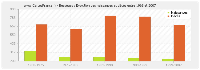 Bessèges : évolution des naissances et décès de 1968 à 2007