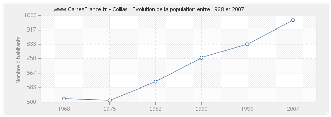 Cette courbe reprend l'historique de la population de Collias de 1968 à 2007 en interpolation cubique. Ceci permet d'obtenir plus précisément la population de la commune de Collias les années ou aucun recensement n'a été effectué.