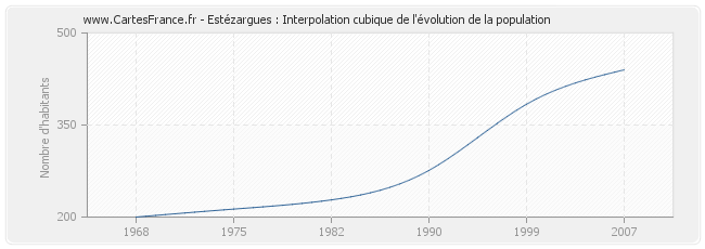 Cette courbe reprend l'historique de la population d'Estézargues de 1968 à 2007 en interpolation cubique. Ceci permet d'obtenir plus précisément la population de la commune d'Estézargues les années ou aucun recensement n'a été effectué.
