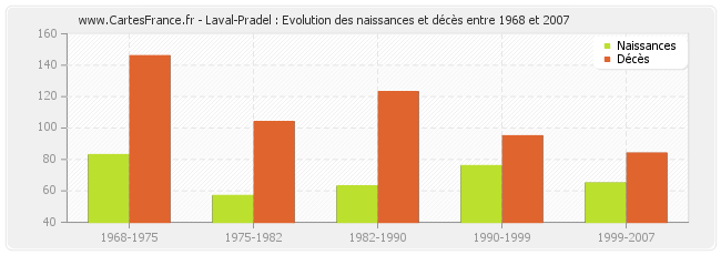 Laval-Pradel : évolution des naissances et décès de 1968 à 2007
