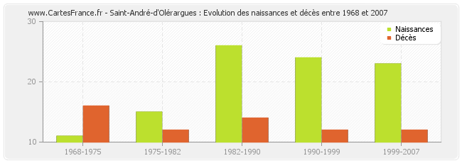 Saint-André-d'Olérargues : évolution des naissances et décès de 1968 à 2007