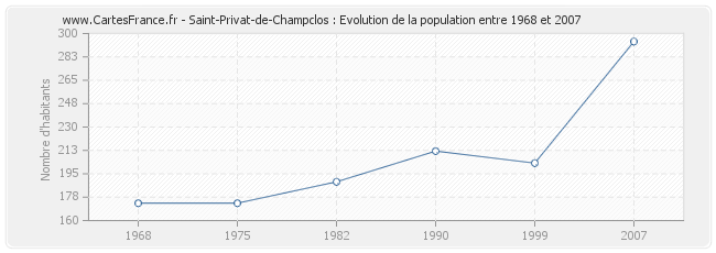 La population de Saint-Privat-de-Champclos était de 294 habitants en 2007, 203 habitants en 1999, 212 habitants en 1990, 189 habitants en 1982, 173 habitants en 1975 et 173 habitants en 1968.