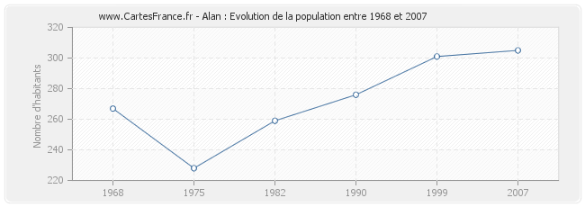 Cette courbe reprend l'historique de la population d'Alan de 1968 à 2007 en interpolation cubique. Ceci permet d'obtenir plus précisément la population de la commune d'Alan les années ou aucun recensement n'a été effectué.