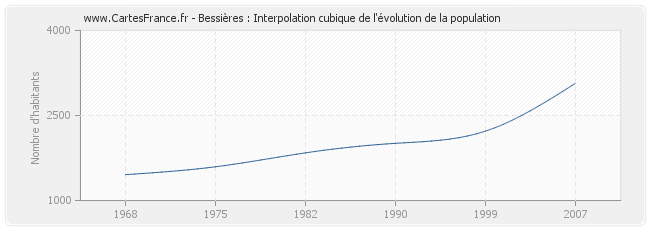 Cette courbe reprend l'historique de la population de Bessières de 1968 à 2007 en interpolation cubique. Ceci permet d'obtenir plus précisément la population de la commune de Bessières les années ou aucun recensement n'a été effectué.