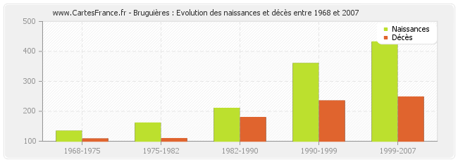 Bruguières : évolution des naissances et décès de 1968 à 2007