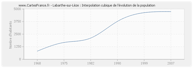 Cette courbe reprend l'historique de la population de Labarthe-sur-Lèze de 1968 à 2007 en interpolation cubique. Ceci permet d'obtenir plus précisément la population de la commune de Labarthe-sur-Lèze les années ou aucun recensement n'a été effectué.