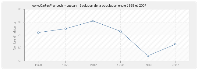 La population de Luscan était de 63 habitants en 2007, 54 habitants en 1999, 73 habitants en 1990, 81 habitants en 1982, 75 habitants en 1975 et 72 habitants en 1968.