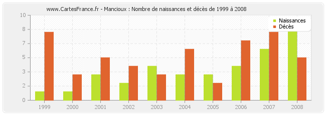 - Mancioux en 2008 : 9 naissances et 5 décès
