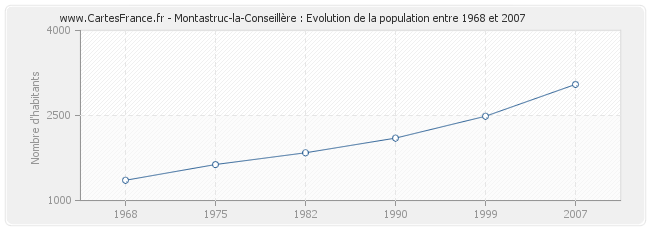 La population de Montastruc-la-Conseillère était de 3 049 habitants en 2007, 2 487 habitants en 1999, 2 101 habitants en 1990, 1 842 habitants en 1982, 1 635 habitants en 1975 et 1 357 habitants en 1968.