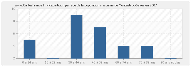 Répartition de la population masculine de Montastruc-Savès par âge en 2007 :
