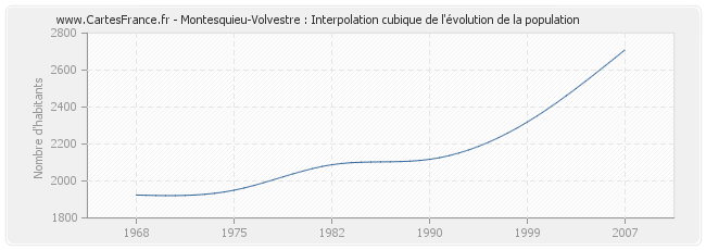 Cette courbe reprend l'historique de la population de Montesquieu-Volvestre de 1968 à 2007 en interpolation cubique. Ceci permet d'obtenir plus précisément la population de la commune de Montesquieu-Volvestre les années ou aucun recensement n'a été effectué.