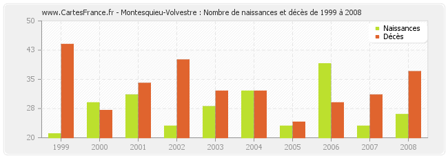 - Montesquieu-Volvestre en 1999 : 21 naissances et 44 décès