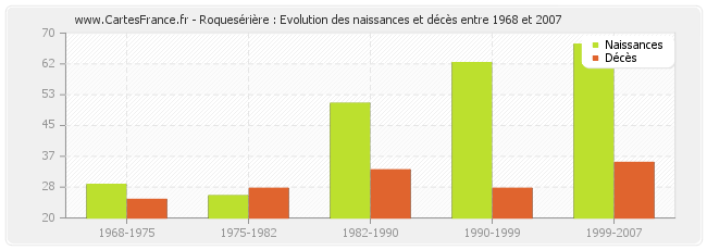 Roquesérière : évolution des naissances et décès de 1968 à 2007