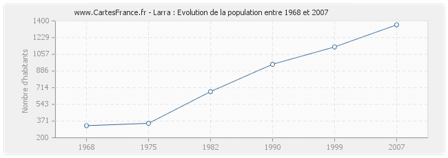 Cette courbe reprend l'historique de la population de Larra de 1968 à 2007 en interpolation cubique. Ceci permet d'obtenir plus précisément la population de la commune de Larra les années ou aucun recensement n'a été effectué.