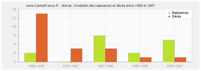 La population d'Antras était de 61 habitants en 2007, 58 habitants en 1999, 51 habitants en 1990, 55 habitants en 1982, 49 habitants en 1975 et 86 habitants en 1968.