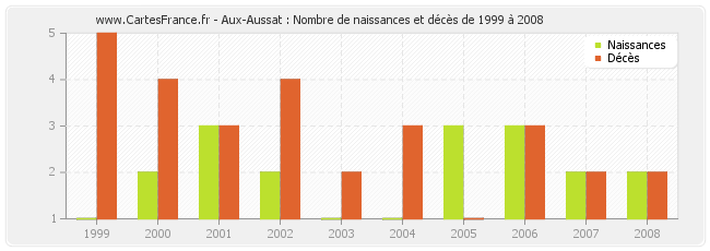 - Aux-Aussat en 1999 : 1 naissances et 5 décès