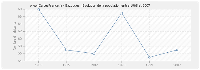 La population de Bazugues était de 57 habitants en 2007, 55 habitants en 1999, 67 habitants en 1990, 56 habitants en 1982, 57 habitants en 1975 et 68 habitants en 1968.