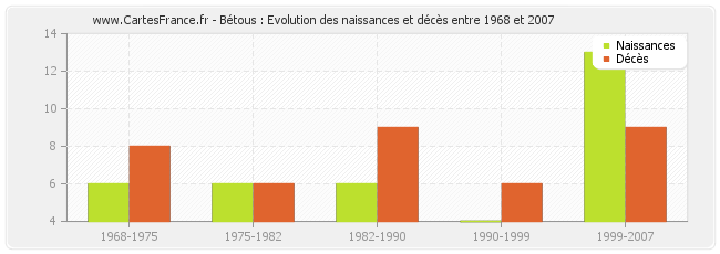 Bétous : évolution des naissances et décès de 1968 à 2007