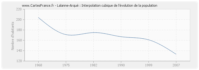 Cette courbe reprend l'historique de la population de Lalanne-Arqué de 1968 à 2007 en interpolation cubique. Ceci permet d'obtenir plus précisément la population de la commune de Lalanne-Arqué les années ou aucun recensement n'a été effectué.