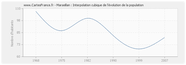 La population de Marseillan était de 80 habitants en 2007, 68 habitants en 1999, 82 habitants en 1990, 100 habitants en 1982, 87 habitants en 1975 et 107 habitants en 1968.
