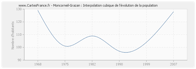 Cette courbe reprend l'historique de la population de Moncorneil-Grazan de 1968 à 2007 en interpolation cubique. Ceci permet d'obtenir plus précisément la population de la commune de Moncorneil-Grazan les années ou aucun recensement n'a été effectué.