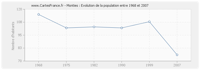 La population de Monties était de 76 habitants en 2007, 108 habitants en 1999, 102 habitants en 1990, 103 habitants en 1982, 102 habitants en 1975 et 115 habitants en 1968.