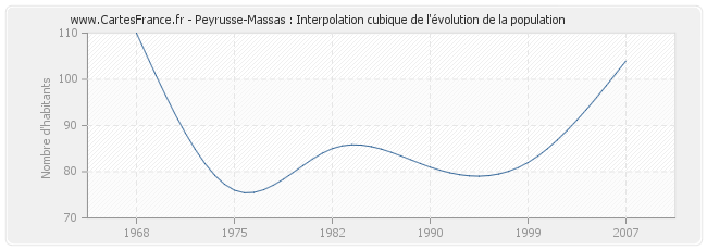 Cette courbe reprend l'historique de la population de Peyrusse-Massas de 1968 à 2007 en interpolation cubique. Ceci permet d'obtenir plus précisément la population de la commune de Peyrusse-Massas les années ou aucun recensement n'a été effectué.