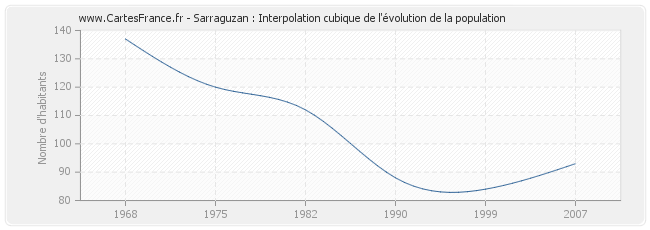Cette courbe reprend l'historique de la population de Sarraguzan de 1968 à 2007 en interpolation cubique. Ceci permet d'obtenir plus précisément la population de la commune de Sarraguzan les années ou aucun recensement n'a été effectué.