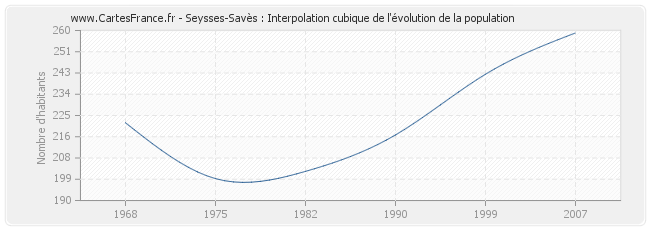 Cette courbe reprend l'historique de la population de Seysses-Savès de 1968 à 2007 en interpolation cubique. Ceci permet d'obtenir plus précisément la population de la commune de Seysses-Savès les années ou aucun recensement n'a été effectué.