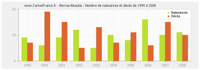 - Bernos-Beaulac en 2008 : 11 naissances et 10 décès