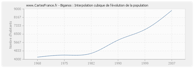 Cette courbe reprend l'historique de la population de Biganos de 1968 à 2007 en interpolation cubique. Ceci permet d'obtenir plus précisément la population de la commune de Biganos les années ou aucun recensement n'a été effectué.