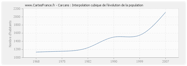 Cette courbe reprend l'historique de la population de Carcans de 1968 à 2007 en interpolation cubique. Ceci permet d'obtenir plus précisément la population de la commune de Carcans les années ou aucun recensement n'a été effectué.