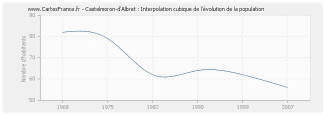 Cette courbe reprend l'historique de la population de Castelmoron-d'Albret de 1968 à 2007 en interpolation cubique. Ceci permet d'obtenir plus précisément la population de la commune de Castelmoron-d'Albret les années ou aucun recensement n'a été effectué.
