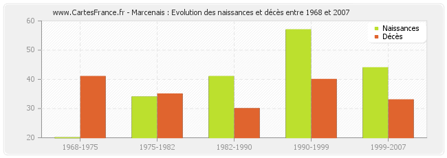 Marcenais : évolution des naissances et décès de 1968 à 2007