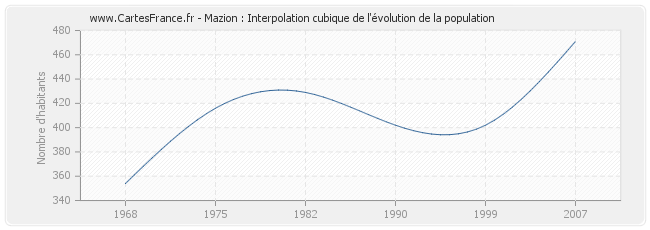Cette courbe reprend l'historique de la population de Mazion de 1968 à 2007 en interpolation cubique. Ceci permet d'obtenir plus précisément la population de la commune de Mazion les années ou aucun recensement n'a été effectué.