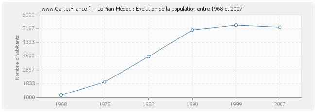 La population de Le Pian-Médoc était de 5 248 habitants en 2007, 5 375 habitants en 1999, 5 078 habitants en 1990, 3 481 habitants en 1982, 1 948 habitants en 1975 et 1 144 habitants en 1968.