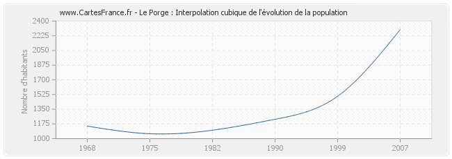 Cette courbe reprend l'historique de la population de Le Porge de 1968 à 2007 en interpolation cubique. Ceci permet d'obtenir plus précisément la population de la commune de Le Porge les années ou aucun recensement n'a été effectué.