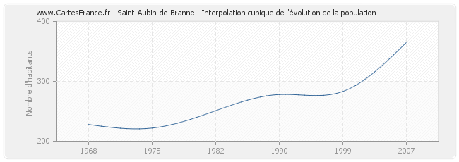 Cette courbe reprend l'historique de la population de Saint-Aubin-de-Branne de 1968 à 2007 en interpolation cubique. Ceci permet d'obtenir plus précisément la population de la commune de Saint-Aubin-de-Branne les années ou aucun recensement n'a été effectué.