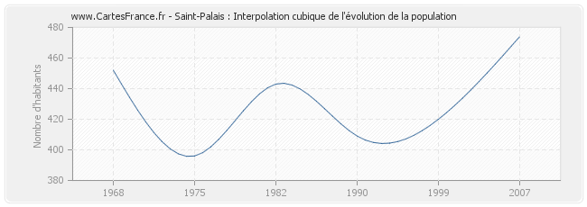 Cette courbe reprend l'historique de la population de Saint-Palais de 1968 à 2007 en interpolation cubique. Ceci permet d'obtenir plus précisément la population de la commune de Saint-Palais les années ou aucun recensement n'a été effectué.