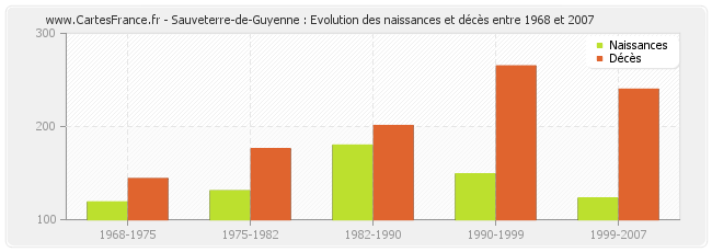 Sauveterre-de-Guyenne : évolution des naissances et décès de 1968 à 2007