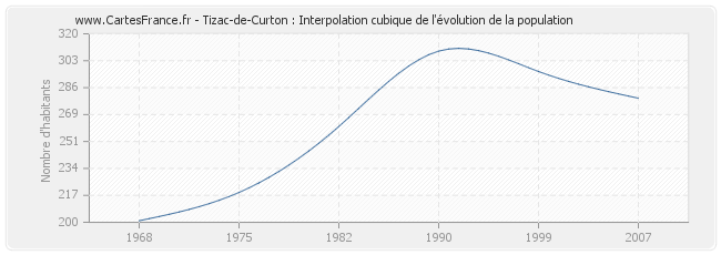 Cette courbe reprend l'historique de la population de Tizac-de-Curton de 1968 à 2007 en interpolation cubique. Ceci permet d'obtenir plus précisément la population de la commune de Tizac-de-Curton les années ou aucun recensement n'a été effectué.