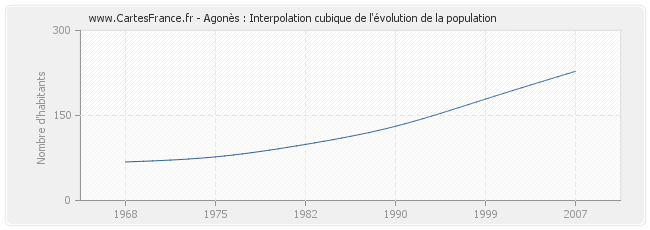 Cette courbe reprend l'historique de la population d'Agonès de 1968 à 2007 en interpolation cubique. Ceci permet d'obtenir plus précisément la population de la commune d'Agonès les années ou aucun recensement n'a été effectué.