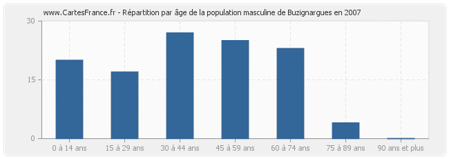 Répartition de la population masculine de Buzignargues par âge en 2007 :