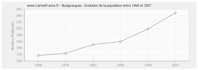 La population de Buzignargues était de 249 habitants en 2007, 199 habitants en 1999, 160 habitants en 1990, 151 habitants en 1982, 124 habitants en 1975 et 117 habitants en 1968.