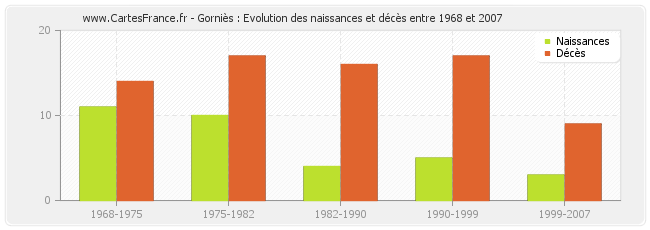 Gorniès : évolution des naissances et décès de 1968 à 2007