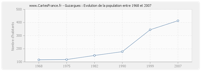 La population de Guzargues était de 414 habitants en 2007, 345 habitants en 1999, 178 habitants en 1990, 149 habitants en 1982, 118 habitants en 1975 et 116 habitants en 1968.