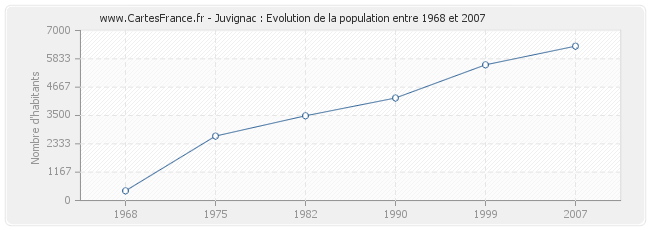 Cette courbe reprend l'historique de la population de Juvignac de 1968 à 2007 en interpolation cubique. Ceci permet d'obtenir plus précisément la population de la commune de Juvignac les années ou aucun recensement n'a été effectué.