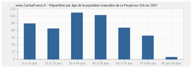 Répartition de la population masculine de Le Poujol-sur-Orb par âge en 2007 :