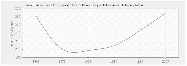 Cette courbe reprend l'historique de la population de Chancé de 1968 à 2007 en interpolation cubique. Ceci permet d'obtenir plus précisément la population de la commune de Chancé les années ou aucun recensement n'a été effectué.