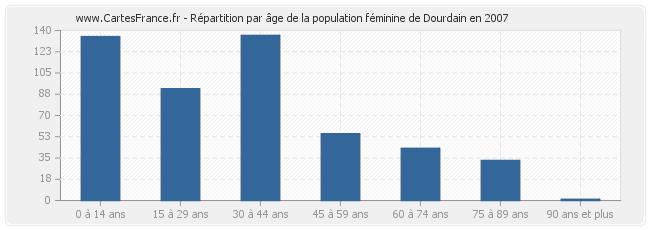 - Femmes de 0 à 14 ans habitant Dourdain : 135